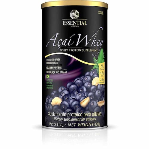 Açaí Whey Açaí Whey é a combinação perfeita de whey protein hidrolisado e isolado obtido através do processo de Cross-Flow Microfiltration, que purifica e mantem as propriedades das proteínas, proporcionando uma melhor absorção de peptídeos de colágeno. O Açaí Whey da Essential Nutrition contém o puro açaí orgânico do Pará, polpa natural de banana e adoçantes naturais. O Açaí Whey é fonte de BCAA (aminoácidos essenciais de cadeia ramificada) que promove a síntese e recuperação muscular além de fortalecer o sistema imunológico e reduzir a inflamação no organismo.