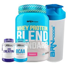 Whey protein blend 900g + premium creatina 100g + bcaa fit 100g + coqueteleira - brn foods Sabor: morango Whey protein blend standard foi elaborada para atender uma variedade de dietas e estilos de vida. Sua fórmula garante absorção da proteína imediatamente é a solução ideal para suprir as necessidades de aminoácidos e carboidrato em qualquer indivíduo.Graças a uma composição completa, a whey protein blend oferece o melhor custo benefício do mercado. Whey protein é a proteína extraída do soro do leite de vaca e esse procedimento industrial possibilita grande concentração de importantes propriedades nutricionais que beneficiam a saúde.Whey protein blend é consumida por pessoas que buscam uma vida mais saudável, praticam atividades físicas e têm o intuito de ganhar massa, melhorar o desempenho nos treinos, acelerar a recuperação dos músculos e aumentar a imunidade. Por conter colágeno hidrolisado, a whey protein blend proporciona firmeza e elasticidade à pele, cabelos, unhas, cartilagens e tendões. Ingredientes: proteína concentrada do soro do leite, proteína isolada da soja, maltodextrina, amilogill - amido de milho ceroso waxy maize , soro do leite, sacarose, espessante goma xantana, aromatizantes, edulcorantes acessulfame de potássio e sucralose. Não contém glúten. ---------------------------------------------Proveniente de um composto produzido naturalmente pelo organismo, a creatina é formada a partir da associação de 3 aminoácidos de alto valor biológico: arginina, glicina e metionina. A premium creatine foods é usada pelo tecido muscular para a produção de fosfocreatina, fator importante na formação de adenosina trifosfato atp , que funciona como um repositor de energia.Recomenda-se a ingestão com água, ou conforme orientação de um médico ou nutricionista. Pode-se adicionar algum carboidrato, como maltodextrina ou sacarose na água, para facilitar seu transporte para dentro da célula muscular. Apresentação: pote de 100g --------------------------------------------- Indispensável para a manutenção e o crescimento dos músculos, o bcaa fit foods promove uma maior recuperação muscular e aumento da resistência no pré e pós-treino, fornecendo um maior efeito anti-catabólico sendo um importante suplemento alimentar para ganhos de massa e recuperação muscular. Apresentação: pote de 100g. Sabor: tangerina.---------------------------------------------