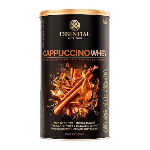 O Whey Protein Cappuccino Essential Nutrition é um suplemento alimentar que combina a qualidade do whey protein com o delicioso sabor de cappuccino. Cada porção contém 22g de proteína e 75mg de cafeína, sendo uma opção ideal para quem busca uma dose de energia e nutrição em um só produto.