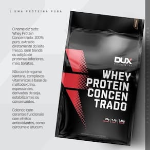 O Whey Protein Concentrado da Dux oferece um perfil nutricional completo, tornando-o uma excelente escolha para consumo antes e depois dos treinos. Cada porção fornece 20g de proteína 100% pura e de alta qualidade, extraída diretamente do soro do leite e sem a adição de blends ou outras proteínas. Possui um perfil completo de aminoácidos, incluindo todos os aminoácidos essenciais, que são cruciais para a construção muscular, a recuperação rápida e a manutenção da massa magra. Sua fórmula balanceada fornece suporte energético equilibrado e uma recuperação mais eficaz. - Ingredientes: Proteína de soro do leite concentrada, cookies sabor chocolate, aromatizantes e edulcorantes sucralose e acesulfame de potássio. - Ideal para Indicado para atletas e pessoas ativas que desejam otimizar sua performance, manter uma dieta equilibrada e para aqueles que querem melhorar sua saúde e desempenho físico. - Pode ser consumido diariamente, em qualquer momento do dia. Prepare com água, leite, frutas ou adicione em suas receitas favoritas.