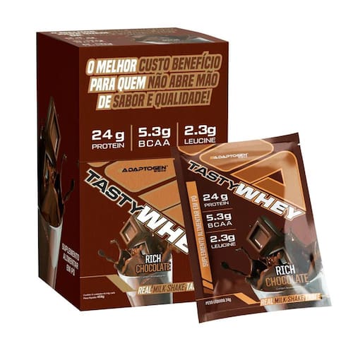 Whey Protein Em Sachê Tasty Whey Sabor Chocolate Suíço Caixa Com 12 Unidades 34g Cada Adaptogen O Whey Protein Sache Packet Tasty Whey Sabor Chocolate Suíço da Adaptogen é uma excelente opção para quem procura uma forma prática e saborosa de aumentar a ingestão de proteínas. Cada caixa contém 12 sachês individuais, facilitando o transporte e o consumo em qualquer lugar, seja na academia, no trabalho ou durante viagens. A fórmula é composta por whey protein de alta qualidade, que auxilia na recuperação muscular e contribui para a manutenção da massa magra. Ideal para quem busca conveniência sem abrir mão do sabor, o Whey Protein Tasty Whey é uma escolha prática para integrar proteínas na rotina diária. Marca: Não Informado