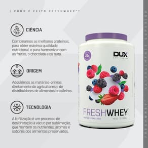 O que é FreshWhey(tm)Apesar das variadas opções de suplementos de proteínas no mercado, encontrar qualidade e sabor, unidos em uma fórmula limpa e pura, é um desafio.Freshwhey(tm) é uma nova categoria de proteínas, totalmente naturais, feitas com frutas e nuts de verdade, que proporcionam sabores reais, com uma fórmula rigorosamente limpa e pura.ProteínasFórmula especial com 3 tipos de proteínas do soro do leite: concentrada, isolada e hidrolisada. Essa combinação traz o melhor de cada uma delas: sabor, pureza e qualidade. São 20g de proteína por dose, com alta qualidade e sabor delicioso.Frutas e NutsPara nós, o melhor sabor vem da natureza. Feito com alimentos naturais, nosso objetivo foi trazer o frescor das frutas e o gosto de verdade do chocolate e das pastas de amendoim e avelã. Isso só é possível através do processo de liofilização, mantendo o sabor original, seu valor nutricional e seus benefícios funcionais.100% NaturalFórmula rigorosamente limpa e pura, feita exclusivamente com matérias-primas naturais, sem ingredientes inferiores ou artificiais. Seguimos um padrão de excelência na escolha de cada proteína, cada fruta, cada ingrediente - é assim que garantimos um produto para consumidores tão exigentes como nós.Por trás do rótulo: ProteínaAs proteínas são os suplementos mais famosos e mais populares. É fácil entender por quê. A proteína é o alicerce nutricional do corpo, sendo encontrada nos músculos, ossos, pele, cabelos, e basicamente em todas as outras partes ou tecidos do corpo.Ela é feita de mais de 20 moléculas construtoras chamados aminoácidos, que participam de muitas reações químicas. Pelo menos 10.000 proteínas diferentes nos fazem como somos, e nos mantém assim.