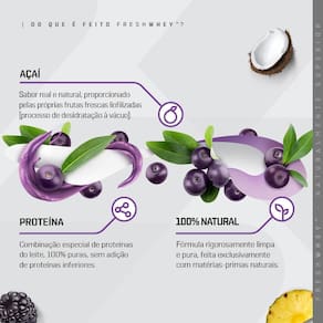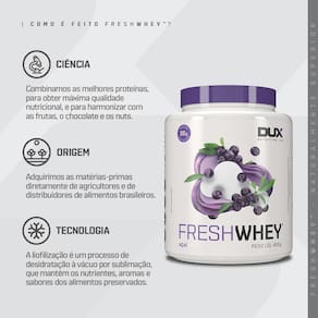 O que é FreshWhey tm Apesar das variadas opções de suplementos de proteínas no mercado, encontrar qualidade e sabor, unidos em uma fórmula limpa e pura, é um desafio.Freshwhey tm é uma nova categoria de proteínas, totalmente naturais, feitas com frutas e nuts de verdade, que proporcionam sabores reais, com uma fórmula rigorosamente limpa e pura.ProteínasFórmula especial com 3 tipos de proteínas do soro do leite: concentrada, isolada e hidrolisada. Essa combinação traz o melhor de cada uma delas: sabor, pureza e qualidade.