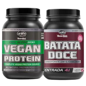 Whey Protein W-Pro 2230 Vegan PROTEÍNA VEGANA Sabor Chocolate 900g, com 22g de proteína por porção + Batata Doce em Pó 100% Pura Suplemento Energético Vegano desenvolvido especialmente para Atletas Sabor Natural 1KgWhey Protein W-Pro 2230 Vegan PROTEÍNA VEGANASuplemento Dietético 100% vegetal, desenvolvido especialmente para vegetarianos, veganos e alérgicos.Grande fonte de aminoácidos essenciais para a manutenção de uma boa saúde, como os BCAAs que são conhecidos por não poderem ser produzidos pelo corpo.Só se consegue obtê-los a partir de ingestão de alimentos proteicos de origem animal ou de suplementação específica. Possui alta concentração de arginina que auxilia na cicatrização, elimina as toxinas, aumenta a imunidade e ajuda a melhorar o desempenho muscular. Auxilia a suprir vitaminas para veganos, como a vitamina B12 e outras. Veja nas imagens da tabela nutricional e do aminograma.Contém proteína isolada de soja, porteína de ervilha, proteína de arroz integral e associações.Principais benefícios:- 100% proteína vegetal- Auxilia no ganho de massa muscular- Alta concentração de arginina- retarda a fadiga e promove definição muscular- Sem açúcar- Sem glúten- Sem lactose- 22g de proteínas por porção- Rico em aminoácidos essenciais como o BCAAModo de preparo:Adicione 3 scoops 30g em 300 ml de água. Mexa bem.Ingredientes:Proteína isolada de soja, proteína de ervilha, proteína de arroz integral, cacau em pó lecitinado, ácido ascórbico, bigliscinato de zinco, acetato de tocoferol, niacina, pirldoxina, cianocobalamina, aroma idêntico ao antiumectante fosfato tricálcio, edulcorante sucralose, edulcorantes naturais, taumatina e glicosídeos de steviol, edulcorante sucralos.Contém derivados de sojaBatata Doce em Pó- 1Kg de suplemento representa 4Kg de Batata Doce.- 20g 1 scoop equivale a 80g de Batata Doce.- Fonte de vitaminas e minerais.- Carboidrato de baixo índice glicêmico.A Batata Doce em Pó é um suplemento de excelente qualidade, proporcionando de forma concentrada a batata doce, um alimento muito querido por todo mundo fitness principalmente para os fisiculturistas e amantes de academia, mas esse produto não é somente destinado a eles, pois todos que desejam ganhar massa magra podem usufruir dos incríveis benefícios. O suplemento fornece as propriedades da batata doce de forma concentrada e pronta para consumo, somente acrescentando em uma bebida de sua preferência e consumindo, em qualquer lugar e qualquer hora.A Batata Doce 100% pura em pó possui exatamente as mesmas propriedades da batata doce convencional, sua diferença está na forma de preparo e utilização, sendo muito mais pratica e podendo ser acrescentada em diversas receitas, por exemplo, omeletes e panquecas com maior facilidade.Ingredientes:Batata Doce integral.Modo de preparo:Adicione 20 g 1 scoop de batata doce integral em 200 ml de água ou bebida de sua preferência. Também pode ser adicionada em omeletes, bolos, panquecas, pães entre outras preparações. Pode ser utilizada como pré-treino ou conforme orientação de nutricionista ou médico.Todos os produtos não contém glúten e são livres de lactose.