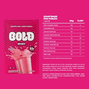 Sache Whey Mousse de Morango 30g - Bold O Whey Mousse de Morango Bold é surpreendente do começo ao fim: cremoso, levemente cítrico e com sabor marcante da fruta. São 22g de proteína por dose, em uma versão prática e deliciosa para incluir na sua rotina. Destaques do Produto - 22g de proteína por porção 30g - Blend de whey concentrado, isolado e hidrolisado - Sabor intenso de mousse de morango - Textura cremosa e refrescante - Perfeito para shakes, vitaminas e receitas fit
