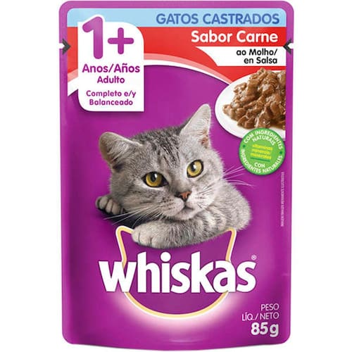 Sache Whiskas Carne ao Molho Para Gatos Adultos Castrados 85g. Ajuda na manutencao do peso;. Refeicao completa e balanceada;. Suculentos pedacinhos cozidos a vapor;. Ajuda a manter a saude do trato urinario;. Porcao ideal de proteina, vitaminas e sais minerais;. Feito com ingredientes naturais de alta qualidade, vitaminas e minerais;. Sem conservantes, sem corantes artificiais e sem aromatizantes artificiais. Marca: Não Informado