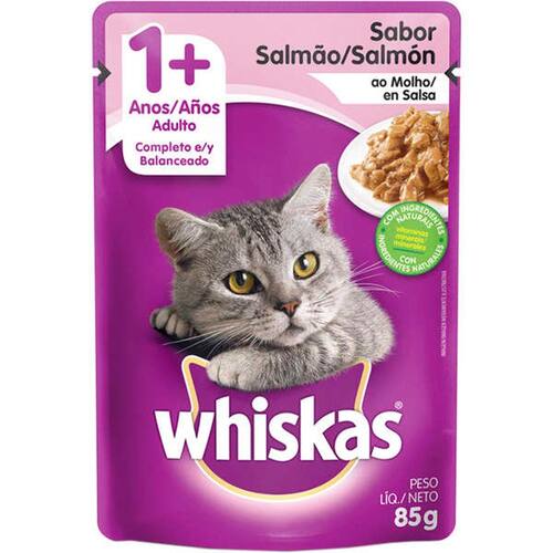 Sache Whiskas Salmao ao Molho Para Gatos Adultos 85g. Refeicao completa e balanceada;. Suculentos pedacinhos cozidos a vapor;. Ajuda a manter a saude do trato urinario;. Porcao ideal de proteina, vitaminas e sais minerais;. Feito com ingredientes naturais de alta qualidade, vitaminas e minerais;. Sem conservantes, sem corantes artificiais e sem aromatizantes artificiais. Marca: Não Informado