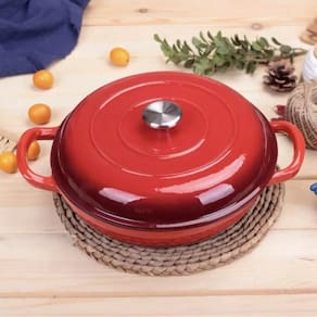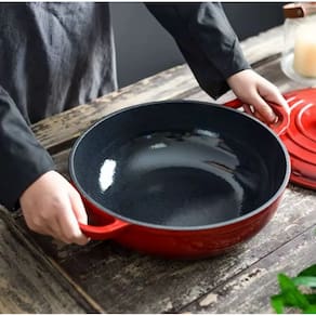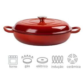 Wok de Ferro Fundido Vermelha 2,5L Prepare suas receitas favoritas com o sabor e a eficiência que só o ferro fundido pode oferecer! Esta wok combina design sofisticado, alta durabilidade e excelente desempenho térmico, sendo perfeita para refogar, selar, fritar ou preparar pratos orientais e tradicionais com qualidade profissional. Características: Material: Ferro fundido de alta qualidade, garantindo resistência e longa vida útil. Espessura: 3,6 mm – distribui e retém o calor de forma uniforme, permitindo cozimento homogêneo e econômico. Capacidade: 2,5 litros – tamanho ideal para o preparo de refeições para pequenas famílias ou porções individuais generosas. Revestimento: Esmalte vitrificado na cor vermelha, resistente a altas temperaturas e fácil de limpar. Interior: Superfície lisa e antiderrapante que evita que os alimentos grudem, mesmo com pouco óleo. Alças ergonômicas: Seguras e confortáveis, facilitam o manuseio durante o preparo e o transporte. Compatibilidade: Pode ser utilizada em todos os tipos de fogão — gás, elétrico, vitrocerâmico e indução, além de poder ir ao forno. Conservação de calor: Mantém os alimentos quentes por mais tempo após o preparo. Benefícios: Ideal para culinária oriental, legumes salteados, carnes e molhos. Realça o sabor dos alimentos e preserva os nutrientes. Design moderno com acabamento em vermelho intenso, que agrega charme à cozinha. Produto robusto, sustentável e livre de produtos químicos nocivos. Dimensões aproximadas: Diâmetro: 26 cm Altura: 7 cm Peso: cerca de 2,8 kg Espessura: 3,6mm Altura total : 11cm