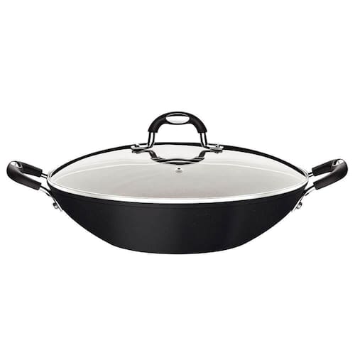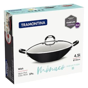 INFORMAÇÕES GERAIS DA PANELA WOK TRAMONTINA INDUCTION EM ALUMÍNIO PRETO COM ANTIADERENTE E TAMPA DE VIDRO - Corpo de alumínio com espessura de 3,0 mm que proporciona cozimento rápido e uniforme. - Revestimento interno e externo de antiaderente Starflon Premium que não gruda, é fácil de limpar, mais durável e não é prejudicial a saúde. - Tampa de vidro temperado com borda de aço inox e saída de vapor. - Alças e pegadores metálicos com proteção de silicone que proporciona redução da propagação de calor, aumentando a segurança e melhorando a empunhadura. - Podem ir à máquina de lavar louças facilitando seu dia a dia.