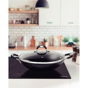 DESCRIÇÃO DA PANELA WOK TRAMONTINA INDUCTION EM ALUMÍNIO PRETO COM ANTIADERENTE E TAMPA DE VIDRO - Preparar refeições especiais para toda a sua família ficou ainda mais prático e funcional com a Wok Tramontina Mônaco Induction em Alumínio com Revestimento Interno e Externo Antiaderente Starflon Premium Preto com Tampa de Vidro 32 cm de diâmetro 4,5 L! - Ela é produzida com corpo de alumínio com espessura especial que proporciona cozimento rápido e uniforme dos alimentos e com revestimento antiaderente Starflon Premium, ela é a escolha perfeita para preparar as refeições do dia a dia, pois os alimentos não grudam em sua superfície e não é prejudicial a sua saúde. - Sua tampa de vidro temperado com bordas em aço inox auxilia e facilita a visualização dos alimentos durante o preparo. - Seu cabo metálico possui proteção de silicone e proporciona redução da propagação de calor, aumentando a segurança e deixando seu manuseio muito mais confortável. - Além disso, ela ainda é fácil de limpar e pode ir à máquina de lavar louças!