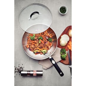para preparar suas receitas com muito mais qualidade e estilo, conte com a wok tramontina solar silicone em aço inox com fundo triplo e tampa de vidro 28 centímetros de diâmetro. Você pode utilizá-la em qualquer tipo de fogão e garante que as receitas cozinhem de maneira rápida e uniforme, pois tem sua produção e, aço inox com fundo triplo. A panela ainda conta com tampa de vidro que auxilia no preparo dos alimentos e alças e pegadores com revestimento em silicone antitérmico, que não aquecem e deixam o manuseio mais seguro e confortável