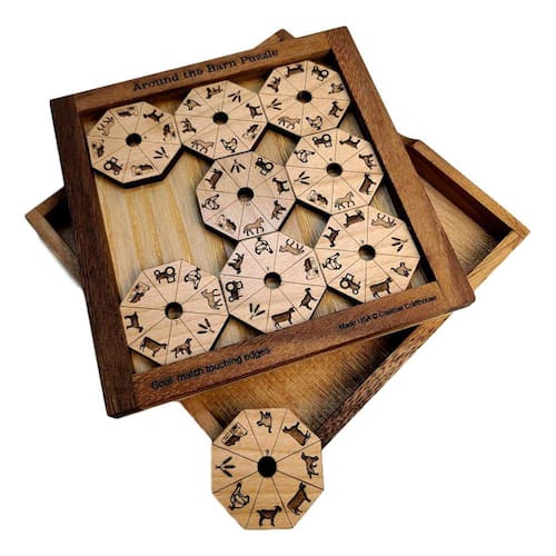 - Os símbolos nas peças são coisas encontradas “ao redor do celeiro”, ou seja, “incluindo um celeiro, gato, cavalo, cabra, feno, trator, vaca, cachorro, galinha