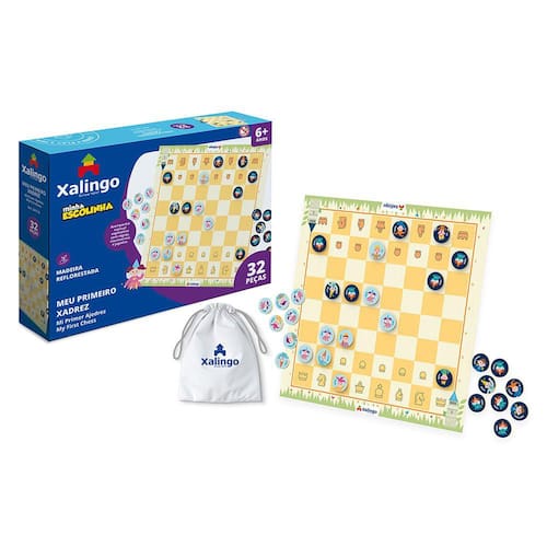 Pronto para jogar e se divertir com a família e os amiguinhos? O jogo Meu Primeiro Xadrez Minha Escolinha, estimula o raciocínio lógico, a concentração e o planejamento estratégico dos pequenos! É composto por 32 peças coloridas e de fácil manuseio, 01 tabuleiro dobrável, 01 saquinho de TNT e um manual explicativo com informações, movimentos e regras. É indicado para crianças a partir de 6 anos, e pode ser jogado por até dois participantes. Além disso, o tabuleiro é dobrável e as peças podem ser guardadas dentro dele, facilitando o transporte e a organização do brinquedo.