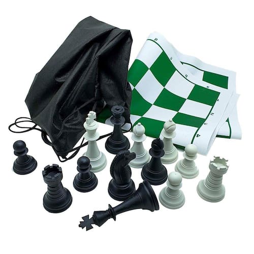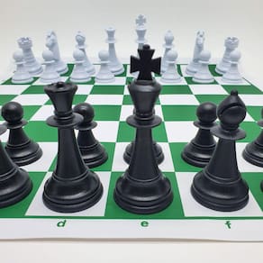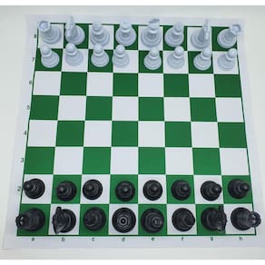 Jogo contendo tabuleiro confeccionado em napa, impresso em silk screen e peças confeccionadas em plástico rígido. Acondicionado em sacola de tecido.