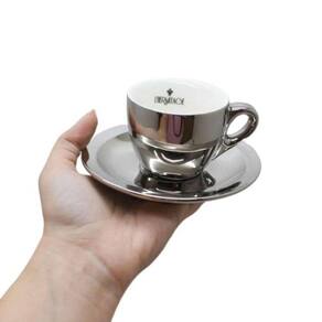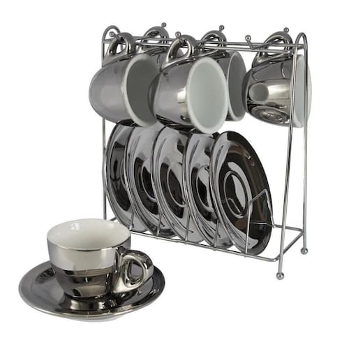 Xícara Café Nespresso Dolce Gusto Porcelana Prata 6 PeçasJogo de 13 peças para café feita em Porcelana new bone china 80ml com pintura externa cromada prata e interna branca e rack em aço inox. medidas itens: 6 Xícaras: 10,5x7,4x6,2cm 6 Pires: Ø12x2cm 1 Rack: L18,5xP8,5xA21cm Linha: Crominno. Marca: L'Hermitage. Especificações Lavar com sabão neutro e não usar produtos abrasivos. Material: Porcelana Cor: Branca, Prata