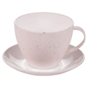 Xícara de plástico com pires para servir café e chá, com decoração predominantemente branca com leves traços/ranhuras pretas por toda a peça, que traz uma aparência marmorizada super requintada ao produto.