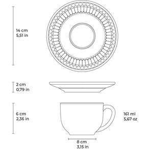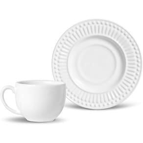 As xícaras de chá Roma trazem conforto no uso e o relevo característico da linha. Em faiança feldspática com esmaltado vitrificado, oferecem resistência e brilho duradouro. O Branco é versátil e coordena com pratos e tigelas da coleção. Compatíveis com micro-ondas e lava-louças. Variações leves de cor e medidas podem ocorrer. Limpeza simples com detergente neutro e esponja macia. Produzido no Brasil. Marca Porto Brasil Cerâmica Coleção Ravenna Linha Roma Branco Material Cerâmica Feldspática Cor Predominante da Base Branco Composição 1 Xícara de Chá e 1 Pires de Chá Dimensões do Produto Xícara de Chá Ø 8cm A = 6cm V = 161ml/ Pires de Chá Ø 14cm A = 2cm