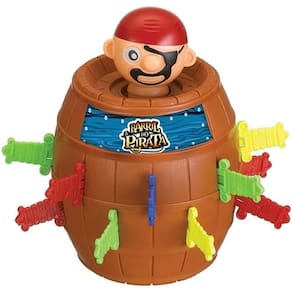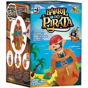 - Jogo Pula Pirata! Reuna os amigos para a diversao Brincar e a melhor parte da infancia.E brincar em grupo, com os amigos ou com a familia, e ainda melhor.O jogo Pula Pirata ja e um classico ha algumas decadas. Ele é perfeito para promover uma competicao saudavel entre a galera que ja tem 6 anos ou mais. Como se joga Com 2 jogadores a brincadeira ja pode acontecer.O jogo funciona assim: Cada participante, na sua vez, coloca a espadinha no barril. Uma aqui, outra ali... E o clima de suspense fica no ar, pois ninguem sabe quando o pirata vai pular. Mas de repente, ao colocar mais uma espadinha, la vai ele, pulando para fora do barril. Que susto E divertido para valer.