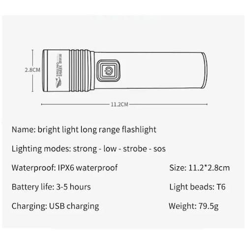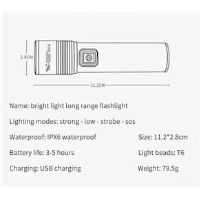 XM-L T6 Built-in Battery LED USB Rechargeable Lanterna Impermeável Mais Brilhante Do Que Luzes Carro Blizzard Prevenção Longa Vida Útil da Bateria Produto Parâmetros Básicos: Contas da Lâmpada: XPES Max Lumens Saída: 500 Distância de Iluminação: 50-150M Peso: 55g Modo de Iluminação: Alta / Baixa / Sos Capacidade da Bateria: 800 mAh Tempo de Vida da Lâmpada: 3-6 H Contas da Lâmpada: T6 Max Lumens Saída: 1000 Distância de Iluminação: 100-300 M Peso: 83 g Modo de iluminação: Alto / Baixo / Sos / Flash slowCapacidade da bateria: 1200 mAhLife Tempo: 5-8HFeatures: 1. Este produto usa contas de lâmpada de alta qualidade, uma vida útil de até 100.000 horas, economia de energia e alta duração da bateria. É a melhor escolha para atividades ao ar livre ao ar livre.2. Built-in bateria de lítio recarregável, não há necessidade de comprar baterias, economizar dinheiro e esforço, interface de micro carregamento, para que você possa usar uma variedade de dispositivos para carregar.3. IPX-4 grau impermeável, também pode ser normalmente em dias chuvosos. Mas, por favor, não o mergulhe em água. NOTAT6 tem 4 modos de iluminação, dos quais, no modo de flash lento, leva uma longa pressão de 1,5 segundos.