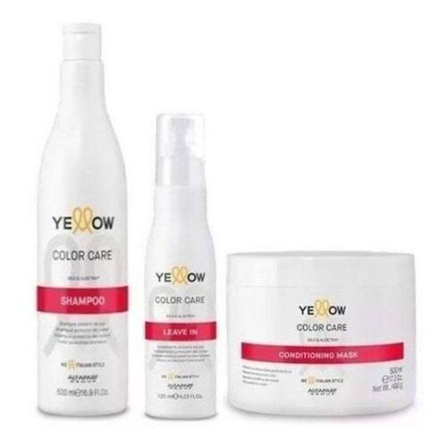 Este kit contém01 shampoo yellow color care gojiberry aloetrix 500ml01 máscara yellow alfaparf color care 500g01 leave-in yellow color care gojiberry aloetrix 125mlA linha Yellow color careO aliado perfeito para os cabelos pintados, no salão e em casa. Exalta e preserva no tempo a intensidade e o brilho de cada cor.Os resultados Depois de 1 mês, cor como recém aplicada85% da intensidadeLuminosidade ampliada+41% depois de um só tratamento Shampoo yellow color care Shampoo protetor da cor para cabelos coloridos.Limpa delicadamente preservando dia após dia a intensidade e a luminosidade dos reflexos.Modo de usoAplicar na pele e nos cabelos molhados, massagear e enxaguar. Máscara yellow color careMáscara protetora de cor para cabelos coloridosRegenera e nutre em profundidade os cabelos coloridos. Ajuda a prolongar a intensidade dos reflexos e a manter os cabelos luminosos e macios ao tato.Modo de usoAplicar nos cabelos molhados e aguardar de 4 a 5 minutos.Enxaguar abundantemente. Leave-in serum yellow color care Tratamento protetor da corSérum ultraleve que ajuda a prolongar a intensidade e a luminosidade da cor, protegendo o cabelo das agressões externas.Modo de usoDistribuir no comprimento e nas pontas. Proceder à secagem e/ou ao penteado. DicaPode ser aplicado também em cabelos secos.
