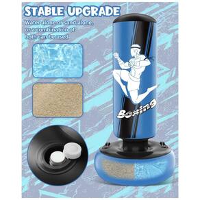 A base larga pode ser preenchida com água ou areia para garantir estabilidade durante o uso, sendo recomendada carga elevada de água para maior firmeza. O produto inclui par de luvas de boxe infantis e apresenta alças laterais para facilitar a movimentação e posicionamento do saco de pancadas em diferentes áreas da casa.?