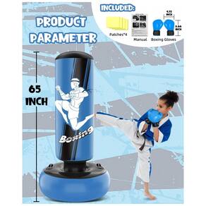 Marca: YORWHIN? Fabricante: ORWHIN? Modelo: Punching Bag-blue (O52S0104GD-Blue)? Tipo de produto: Saco de pancadas inflável infantil em pé? Tamanho nominal: 66"? Esportes indicados: Boxe, kickboxing, taekwondo? Cor: Azul? Tema/time associado: MMA? Liga (descrição do anúncio): MMA? Faixa etária recomendada: Juvenil (youth), aproximadamente 3 a 14 anos? Material predominante: Policloreto de vinila (PVC)? Estrutura de câmaras de ar: 3 câmaras independentes? Altura aproximada do produto: 168 cm? Diâmetro aproximado da base: 58 cm Dimensões do item (comprimento x largura x altura): 19 cm x 19 cm x 10 cm Dimensões da embalagem (comprimento x largura x altura): 23,2 cm x 16,5 cm x 15,5 cm? Peso do produto: 1,13 kg Peso do pacote (produto + embalagem): 1,20 kg? Base: Compartimento inferior para preenchimento com água ou areia? Recursos adicionais: Alças laterais para movimentação? Estilo: Fighting Style 01? Itens inclusos na embalagem: 1 saco de pancadas inflável, 1 par de luvas de boxe? Manual do usuário: Manual em inglês? Marca: Não Informado