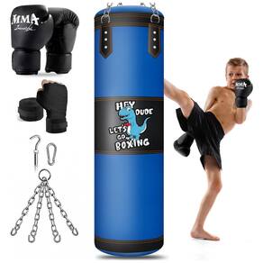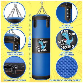 O Kit de Boxe Infantil YORWHIN oferece um conjunto completo e de altíssima qualidade para crianças se divertirem praticando boxe, kickboxing, karatê, muay thai e taekwondo. Inclui um saco de pancadas suspenso de 82 cm (2.7 pés) - que vem vazio para que você possa preencher com materiais diversos, como areia, tecido velho ou espuma, garantindo a segurança e personalização do peso (recomenda-se não ultrapassar 20 kg) -, um par de luvas de boxe de 170g (6 oz) feitas com espuma extra grossa e couro sintético resistente que protegem as mãos das crianças, além de bandagens para as mãos que oferecem suporte extra às articulações. O saco é confeccionado com uma estrutura multilayer em tecido Oxford e couro PU, projetada para absorver impactos e proteger os pulsos e articulações dos pequenos durante os treinos. O conjunto ainda traz todos os acessórios necessários para fixação: corrente para pendurar, gancho de expansão e mosquetão resistente, facilitando sua instalação no teto ou na parede. Com formato divertido de dinossauros, este kit estimula a coordenação motora, melhora a precisão de chutes, socos e joelhadas e promove o desenvolvimento físico e a disciplina dos jovens atletas. Leve, portátil e ideal como presente que alia diversão e atividade física, o YORWHIN Kit de Boxe Infantil é perfeito para treinos em casa ou em academias, incentivando a prática de esportes de maneira segura e agradável para crianças de diferentes idades.