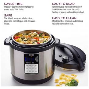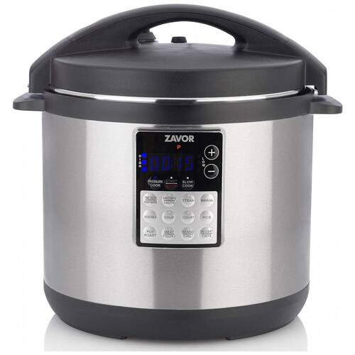 A Panela Elétrica Multifuncional Zavor LUX Edge oferece incrível versatilidade em um único aparelho. Com funções de pressão alta e baixa, cozimento lento, preparo de arroz branco, arroz integral, risoto, cozimento a vapor, iogurte, legumes, sopas, assados, carnes, aves, feijão, sobremesas, aveia, refogar, dourar, manter quente e programação de tempo para o cozimento ideal. Equipada com 4 ajustes diferentes para o cozimento de arroz branco, arroz integral, risoto e cozimento a vapor. A função de cozimento a vapor preserva os nutrientes dos alimentos. Possui função manual que permite usar como panela de pressão, panela de cozimento lento ou panela tradicional. Você pode preparar iogurte caseiro em um simples processo de 2 etapas. O recurso de manter quente garante que a comida permaneça aquecida até desligar. Permite programar um atraso de até 6 horas. Ícones retroiluminados no painel indicam o método de cozimento em uso. Possui função de mudo para programação silenciosa. Aprovada pelo ETL. A Panela Multifuncional não abre se estiver travada ou sob pressão. O potente elemento de aquecimento permite que a panela atinja pressão/temperatura mais rapidamente. A Panela de 7,57 Litros usa 1300 watts. Inclui uma panela removível de aço inoxidável resistente à lava-louças livre de PFOA e PTFE, uma grelha de aço inoxidável, um guia rápido, um manual do usuário e um livro de receitas digitais com mais de 120 receitas.