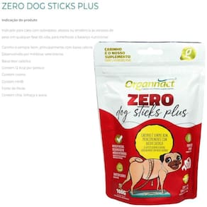 Zero Dog Sticks Plus 160g Organnact Suplemento Para Cães ObesosIndicado para cães com sobrepeso, obesos ou tendência ao excesso de peso em qualquer fase da vida, para melhorar o balanço nutricional.Carinho é sempre bom, principalmente com baixa caloria.Desenvolvido por médicos-veterinários.Baixo teor calórico.Contém 12 Kcal por petisco.Contém cromo.Contém HMB.Fonte de fibras.Contém chia, linhaça e aveia.Modo de uso:Fornecer, por via oral, 1 a 6 unidades por dia.Recomenda-se o fornecimento gradativo, para que sejam evitados distúrbios digestivos.Para isso, o produto deve ser fracionado e oferecido aos poucos, de forma com que a quantidade aumente ao longo dos dias.Composição Básica: Farelo de aveia 6% , farinha de arroz, farinha de linhaça Linum usitatissimum 1% , sementes de chia Salvia hispanica 3% , levedura de cervejaria inativada e desidratada, levedura de cana de açúcar inativada e desidratada, picolinato de cromo, beta-hidroxi metil butirato - HMB, sorbato de potássio, propionato de cálcio, ácido ascórbico, ácido cítrico, concentrado de tocoferóis, hidrolisado de fígado de aves, celulose em pó, gelatina.
