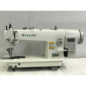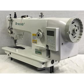 Máquina de costura industrial zig zag eletrônica com motor Direct Drive, lubrificação automática, corte automático de linha, painel de controle e arremate automático. Largura máxima do zig zag de 5mm (padrão) e 10mm (3 pontos). Comprimento máximo do ponto de 2.5mm. Inclui mesa e motor.Alça retrátil